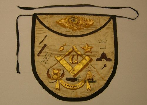 Above is the apron of Brother Samuel Harper, who was a member of Union Lodge, No. 63 (and later member of Howard Lodge, No. 81); this apron was worn, among other places, to the cornerstone laying of the B & O railroad on July 4, 1828 as well as to the re-internment ceremony of Grand Master Coats (the first Grand Master of the Grand Lodge of Maryland) in June 1835. Below right, Centreville Lodge No. 180, is a Past Master Jewel that was presented to Brother E. Clyde Walls in 1925 (provided by his widow to the museum in 1970).