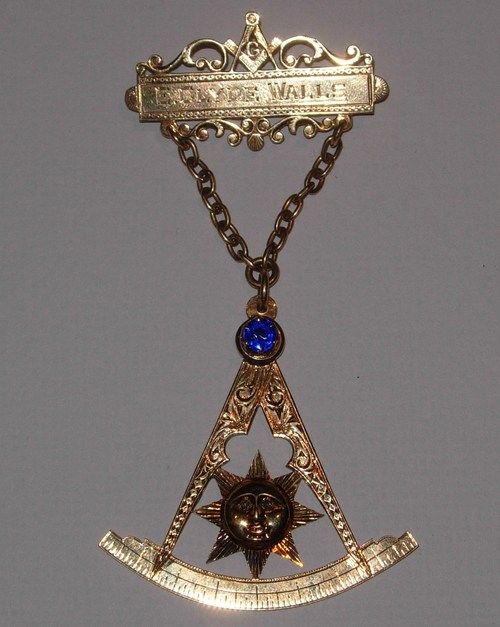 Above is the apron of Brother Samuel Harper, who was a member of Union Lodge, No. 63 (and later member of Howard Lodge, No. 81); this apron was worn, among other places, to the cornerstone laying of the B & O railroad on July 4, 1828 as well as to the re-internment ceremony of Grand Master Coats (the first Grand Master of the Grand Lodge of Maryland) in June 1835. Below right, Centreville Lodge No. 180, is a Past Master Jewel that was presented to Brother E. Clyde Walls in 1925 (provided by his widow to the museum in 1970).